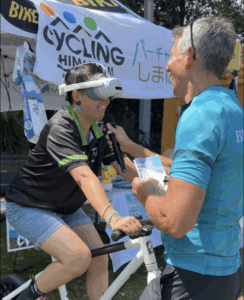 The booth offered an immersive virtual cycling experience of the Shimanami Kaido using a VR headset , along with a lucky dip, attracting many visitors throughout the day.
